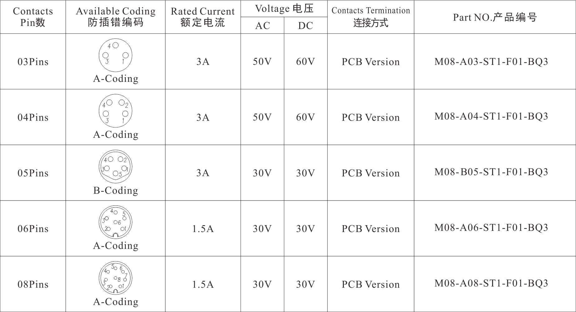 Part No 产品编码:M08-X**-ST1-F01-BQ3