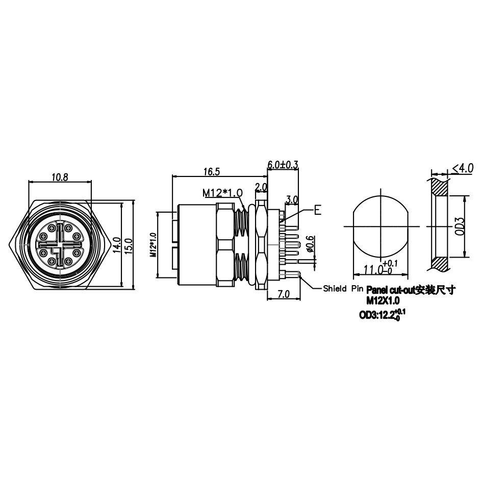 M12 母头面板式,PCB型,前锁安装,屏蔽针