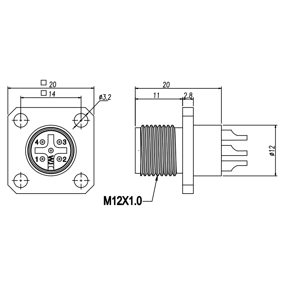 M12 公头面板式,焊接式,方形法兰型